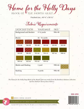Featuring Kim Diehl’s new Baubles & Balsam collection, the Home for the Holly Days quilt is a picture of warmth and coziness in red, green, and gold prints. It will remind you that there’s no place like home for the Holly Day season. Kit includes the fabrics as listened on pattern and plenty extra!!! backing not included